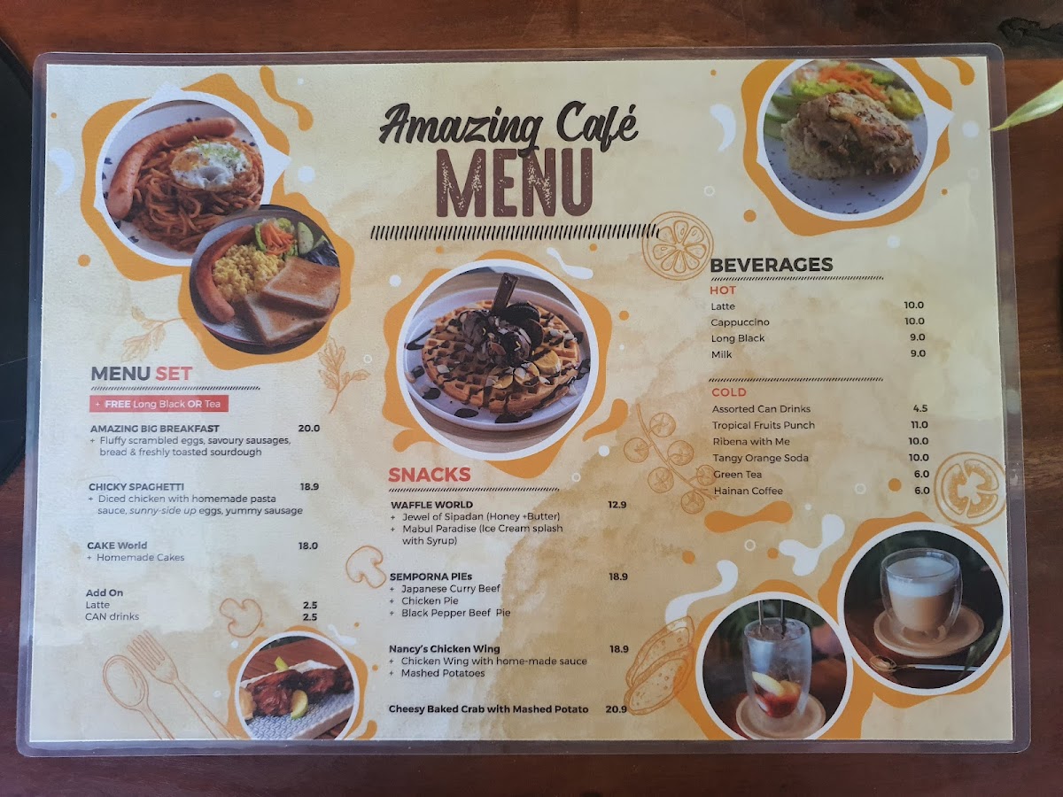 Welcome to Amazing Cafe, located in the heart of Semporna, Sabah. This charming cafe is part of the Semporna Seafront Resort, offering a cozy escape after a day of exploring the stunning marine life nearby. The menu is a delightful blend of local and international flavors, making it perfect for both casual coffee breaks and hearty meals.